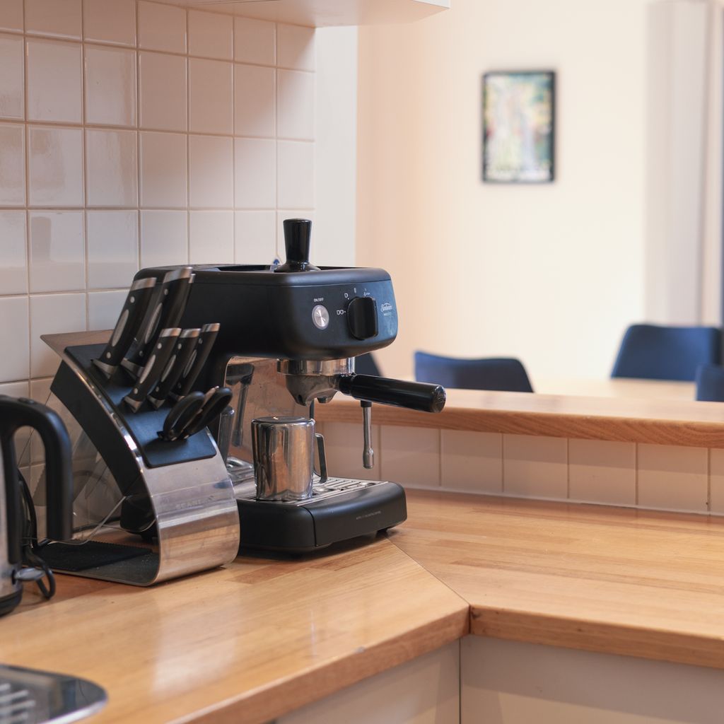 Inside, you'll find everything you need for a comfortable and enjoyable stay. The living area is tastefully furnished and includes a Smart TV, a sound system, and a selection of board games and puzzles to keep everyone entertained. The fully equipped kitchen features a coffee machine and has everything you need for preparing casual meals and family feasts. There's also a dining area, perfect for enjoying meals together after a day at the beach.