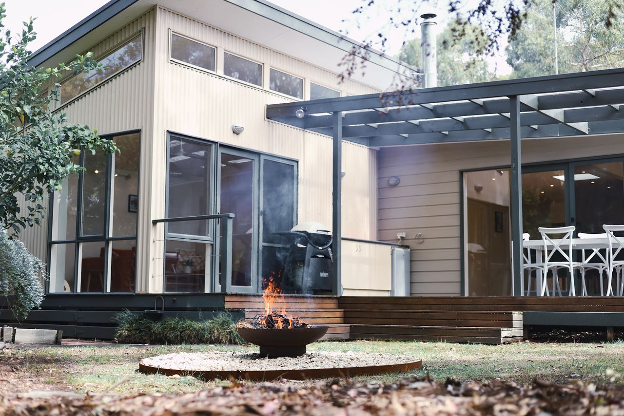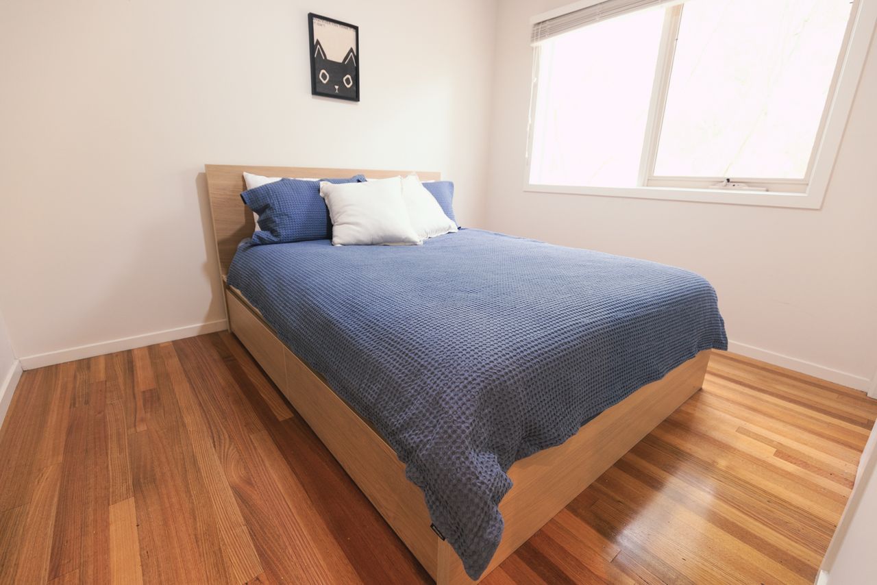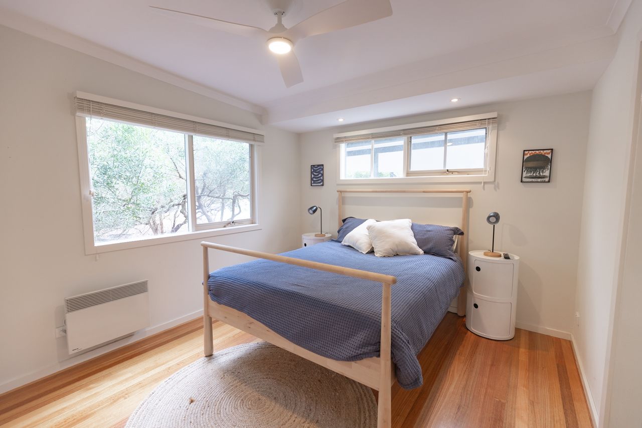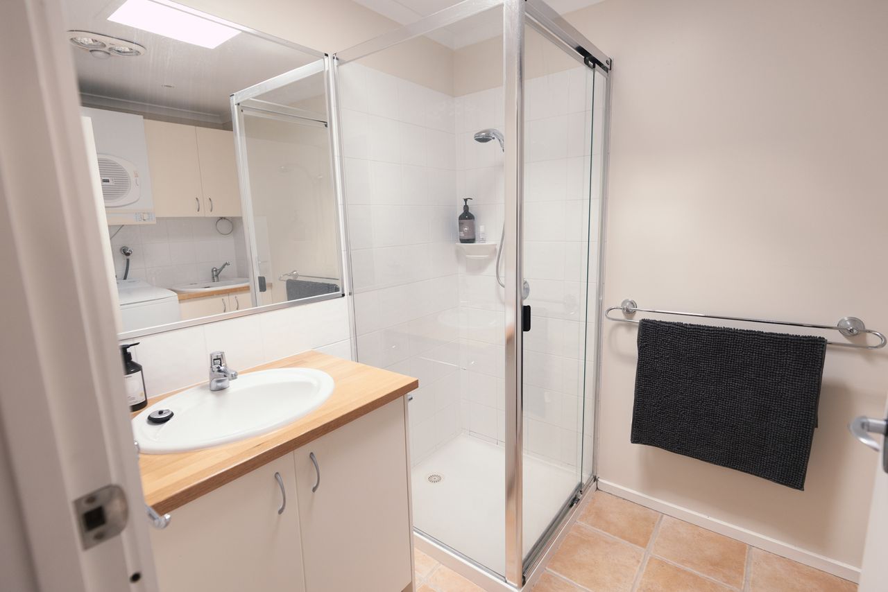 Two bathrooms both have a shower, the ensuite includes a toilet and there is a further separate toilet. Additional comforts include ceiling fans and heating in every bedroom, wall-mounted reverse cycle heating and cooling, and an enclosed wood heater to keep you cozy in cooler months. Extra pillows and blankets are available, and room-darkening blinds ensure a restful night’s sleep. For your convenience, the home offers a laundry area with a washing machine and dryer.