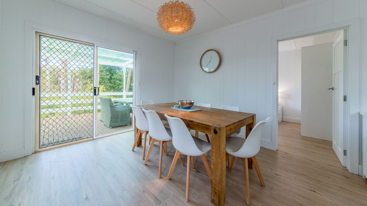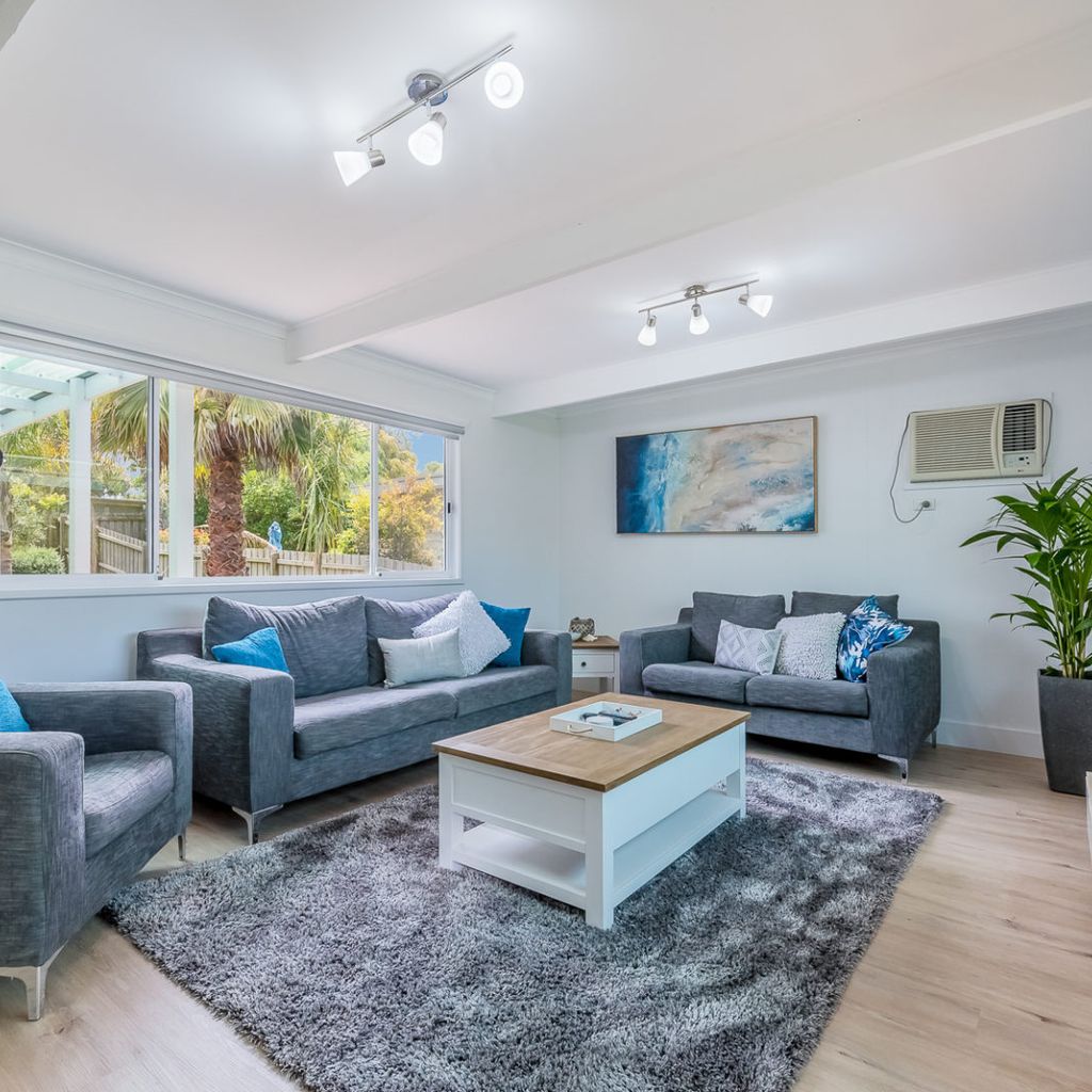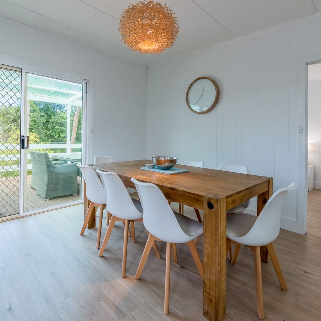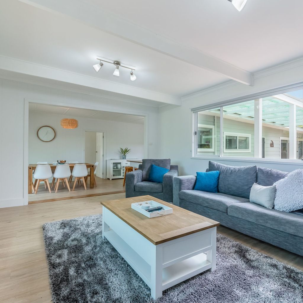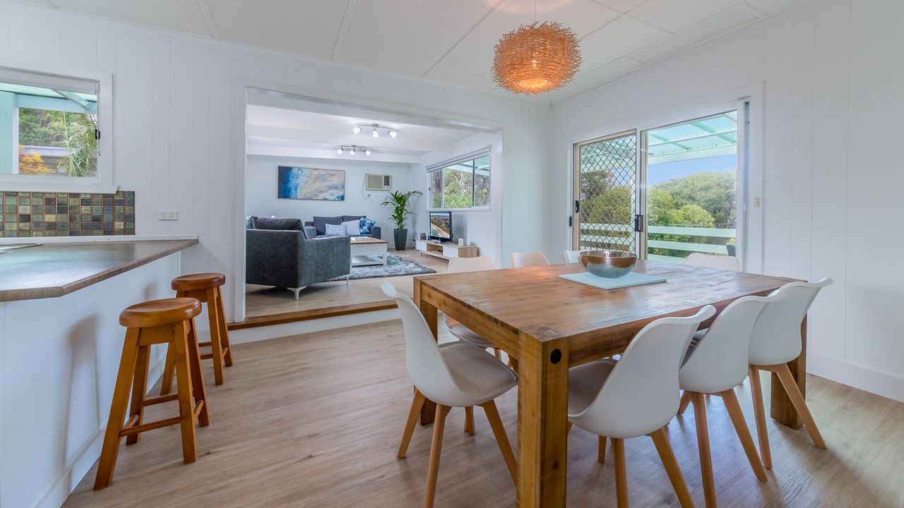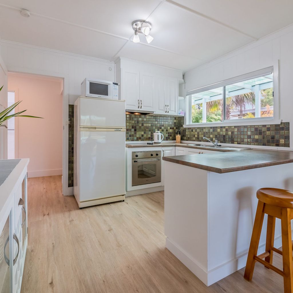 Step inside this cozy property and follow the main hallway through to a bright, open-plan kitchen, dining, and living area - beautifully modernised to create a relaxing space the whole family will love. The well-equipped kitchen features an electric oven, electric glass-top cooktop, and a handy two seater breakfast bar for casual meals. Adjacent is the dining area with an eight-seater table, opening directly onto an undercover front deck complete with an outdoor setting and lounge - perfect for enjoying your morning coffee or unwinding in the evenings.