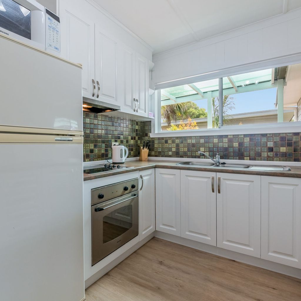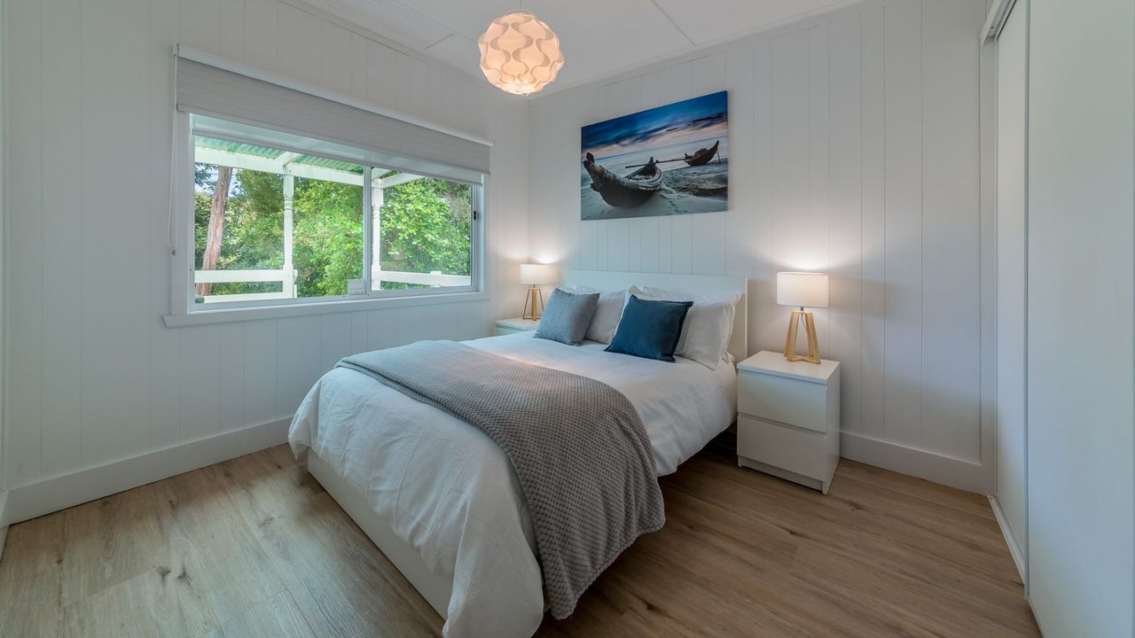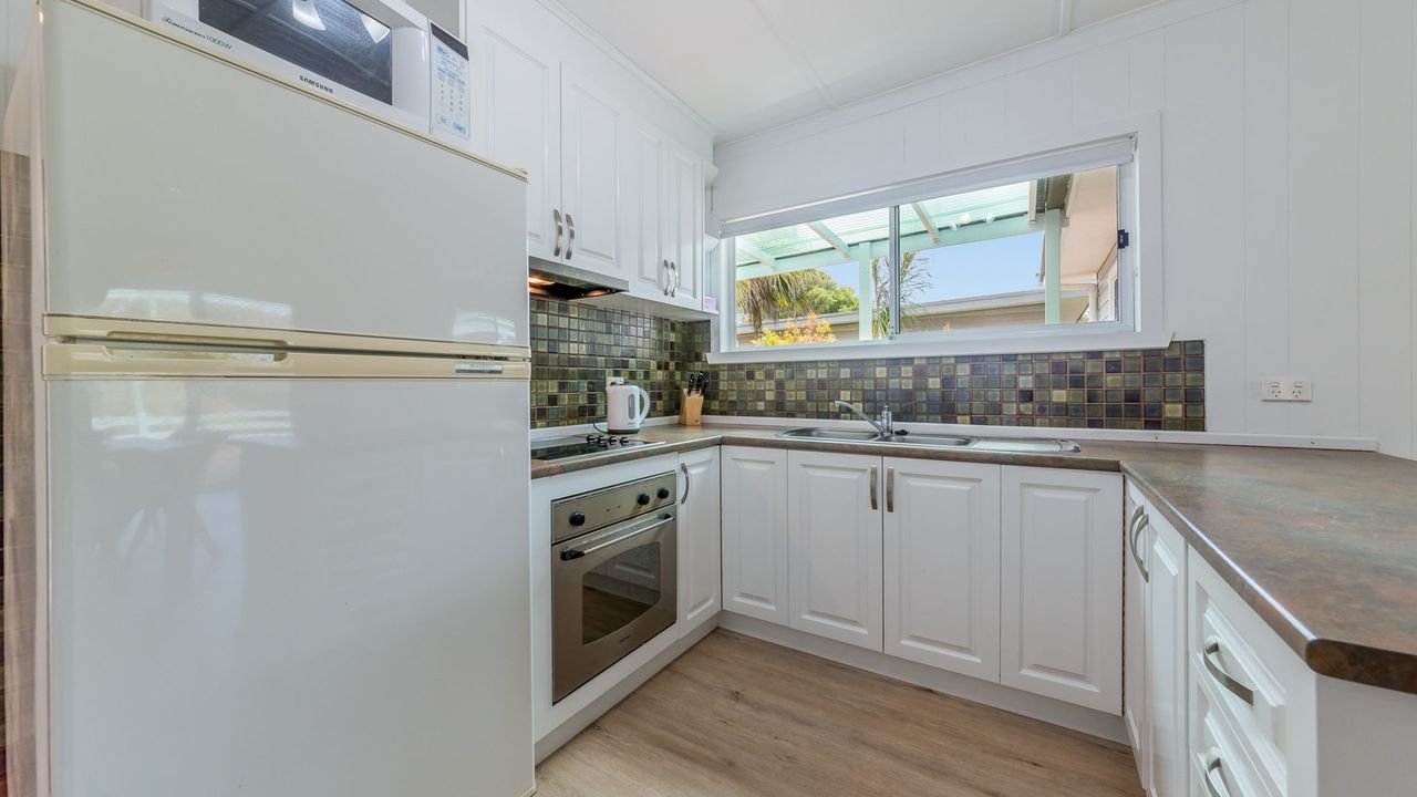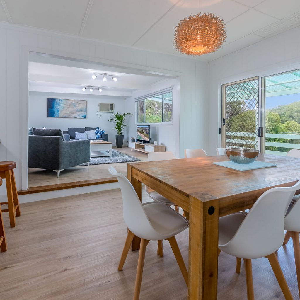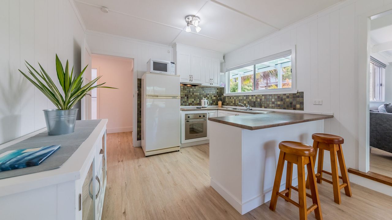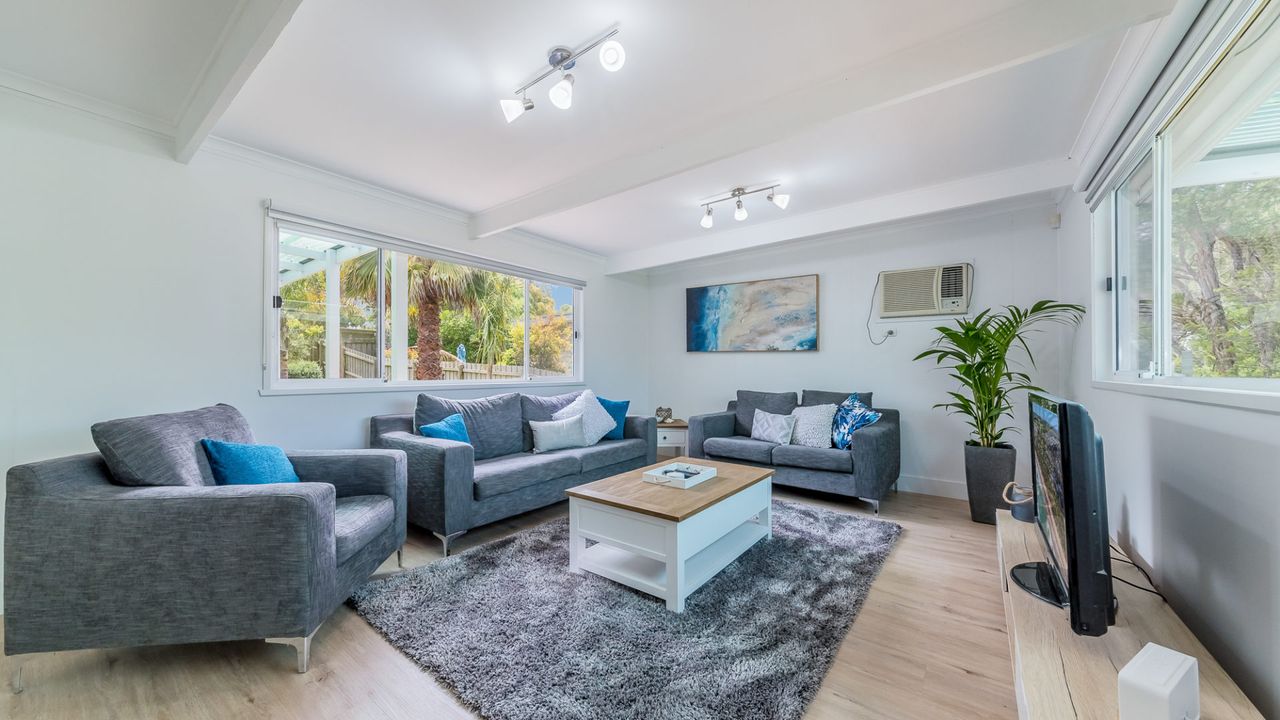 Step inside this cozy property and follow the main hallway through to a bright, open-plan kitchen, dining, and living area - beautifully modernised to create a relaxing space the whole family will love. The well-equipped kitchen features an electric oven, electric glass-top cooktop, and a handy two seater breakfast bar for casual meals. Adjacent is the dining area with an eight-seater table, opening directly onto an undercover front deck complete with an outdoor setting and lounge - perfect for enjoying your morning coffee or unwinding in the evenings.