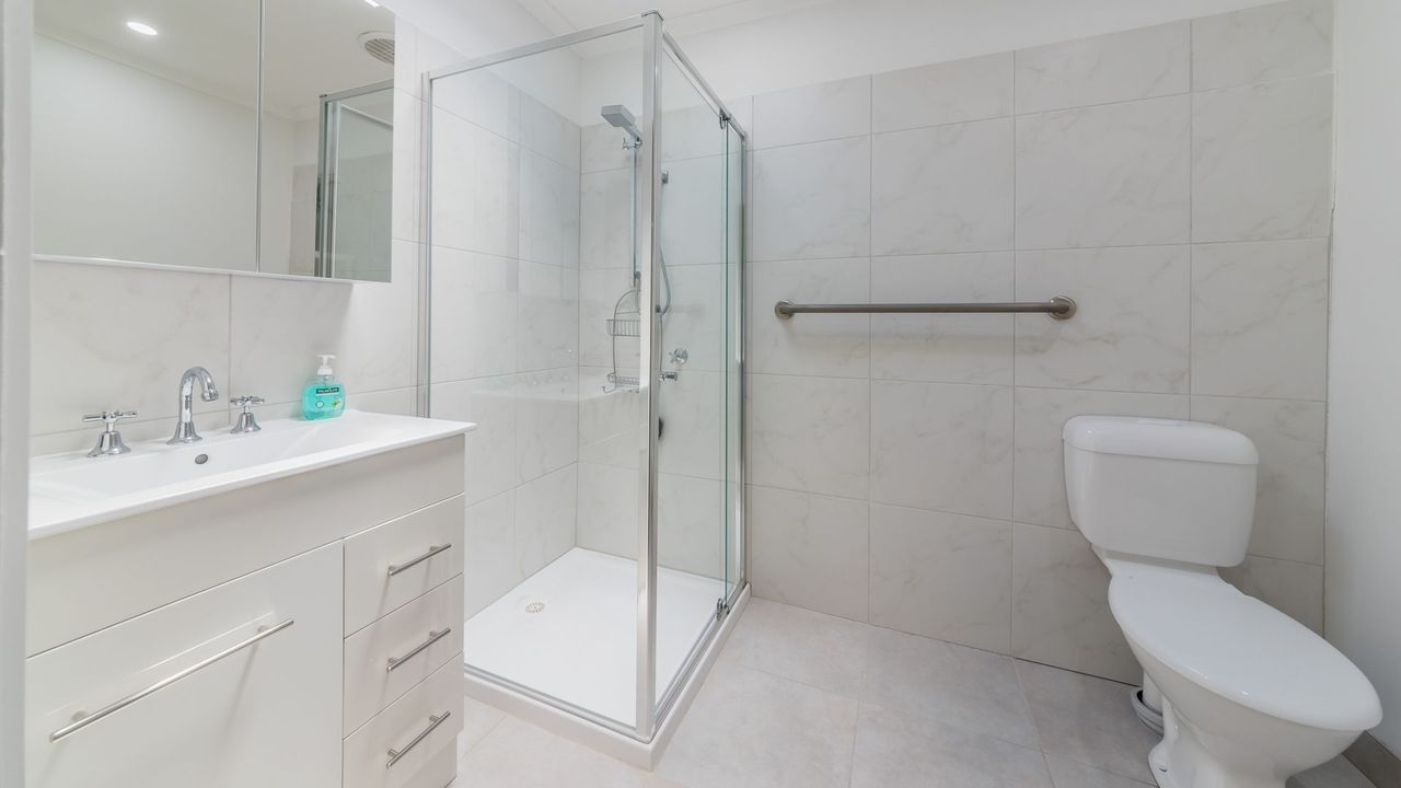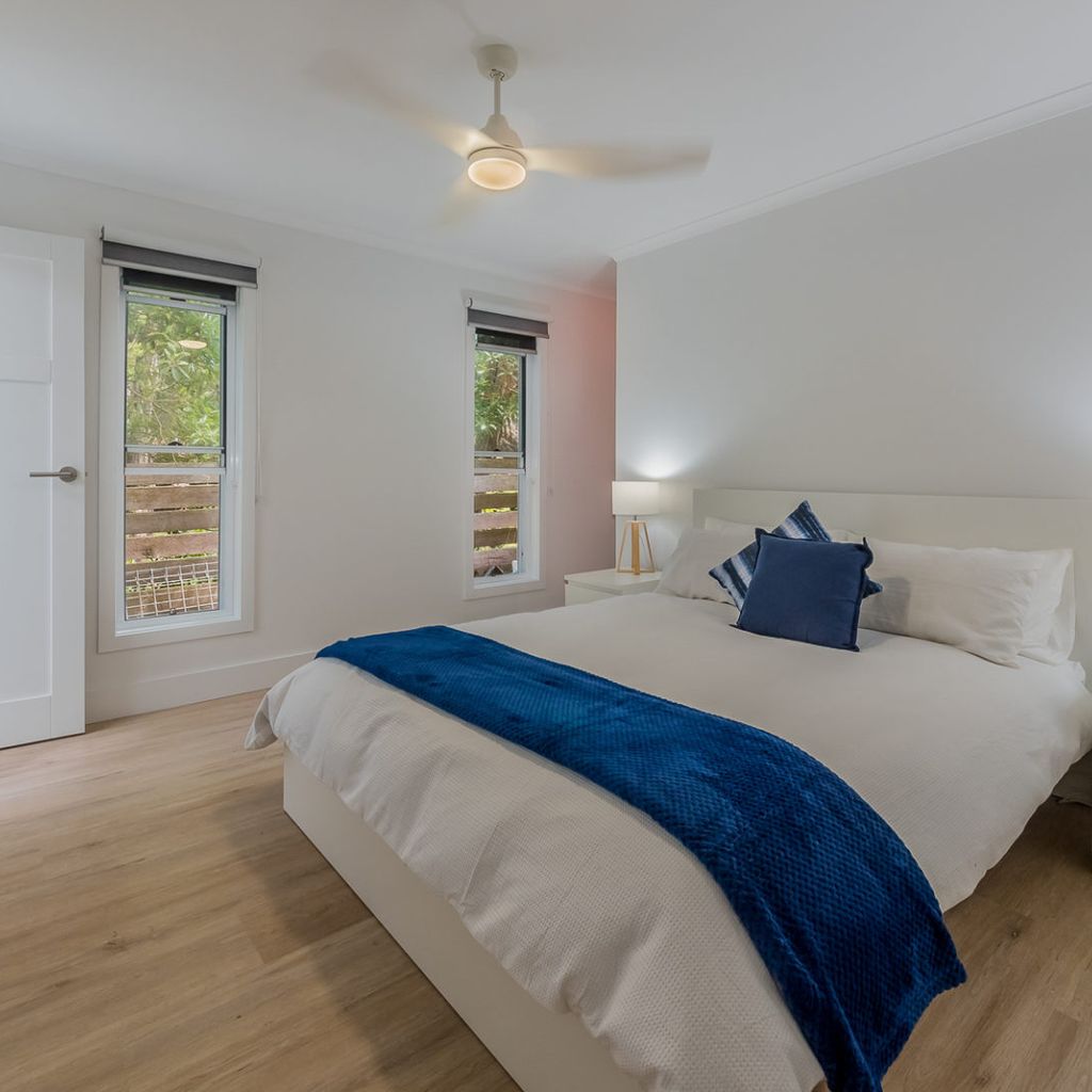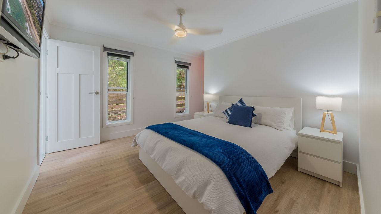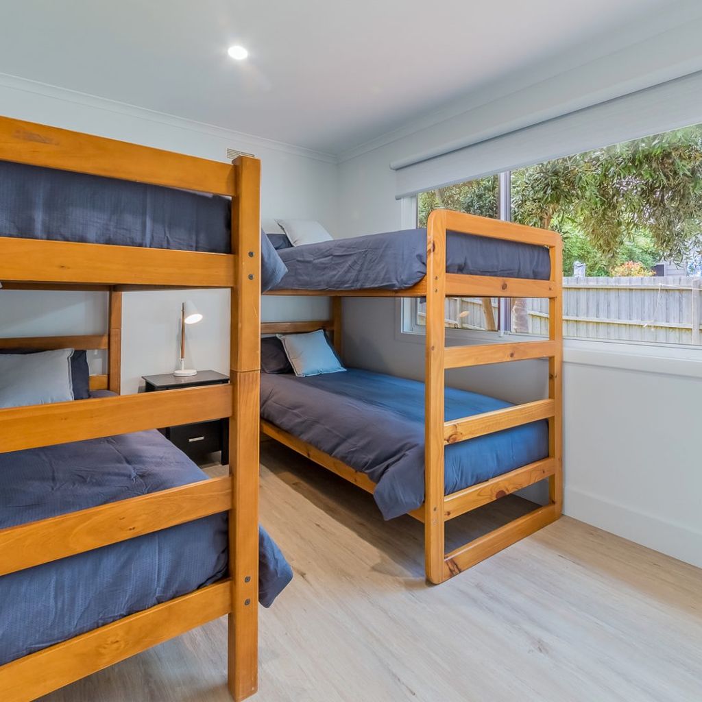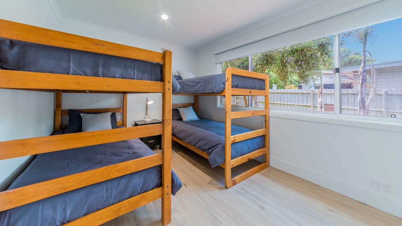 With four bedrooms all boasting split system heating and cooling, there’s plenty of room for everyone. Three bedrooms sit just off the main hallway, including the master, which features a queen bed, wall-mounted TV, ceiling fan, and a private ensuite. The additional bedrooms include one with a double bed and another with two sets of single bunk beds—ideal for kids or larger groups. The fourth bedroom, located off the dining area, also offers a double bed. The main bathroom, positioned off the hallway, includes a shower and toilet for added convenience.