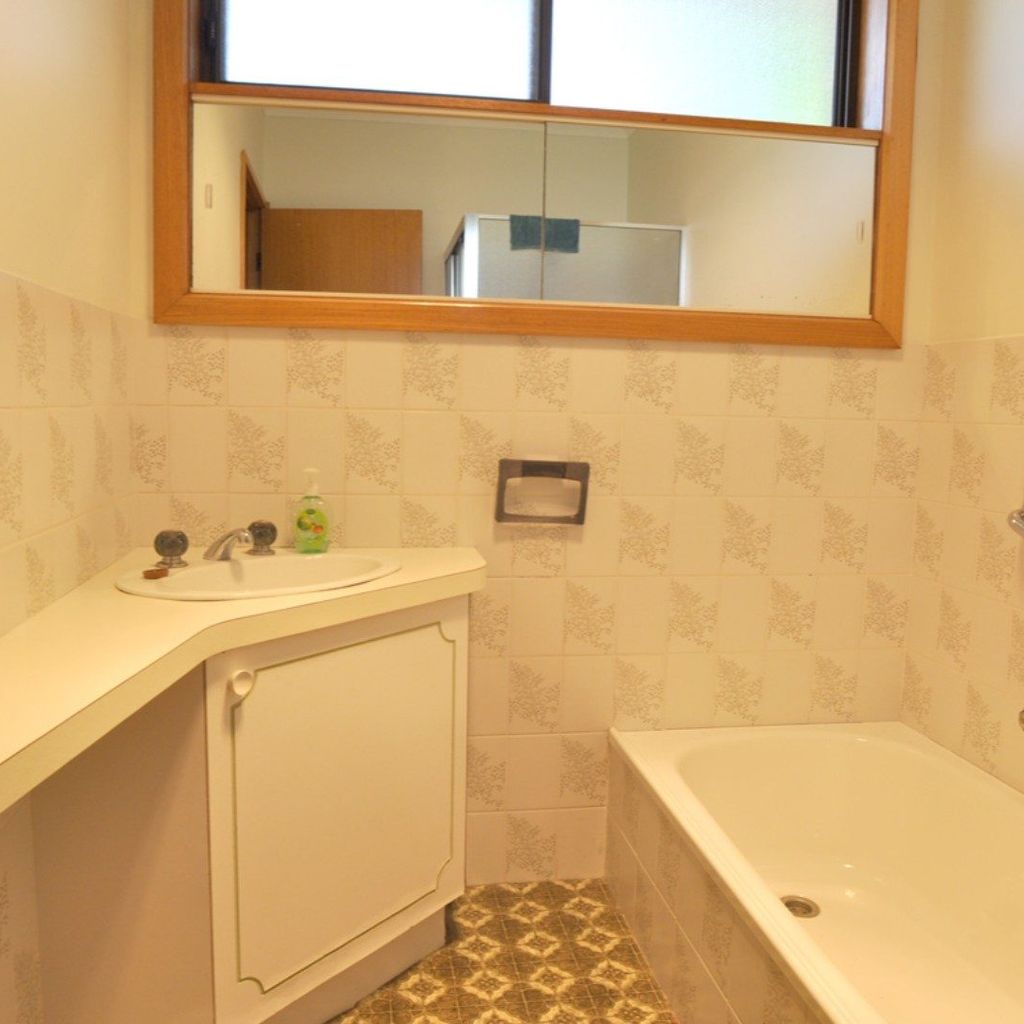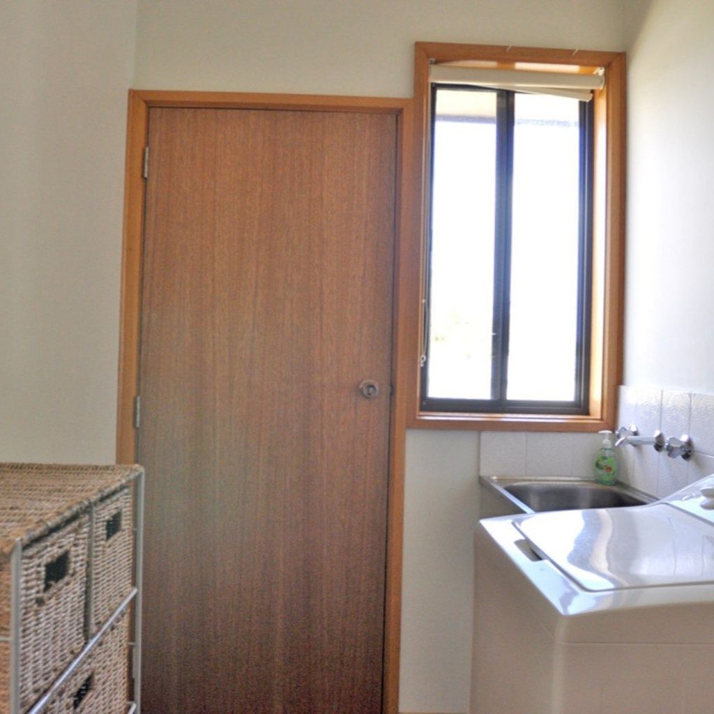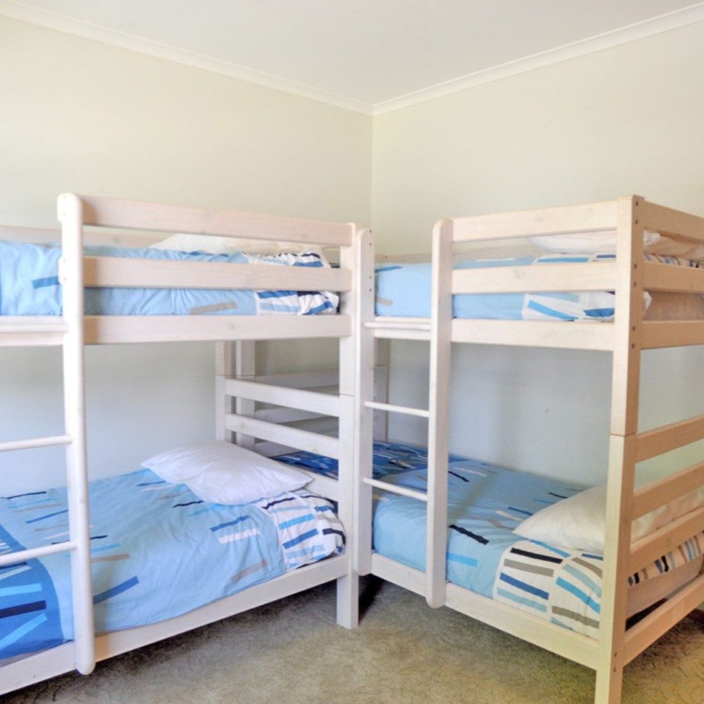 All three of the bedrooms, as well as the family bathroom and laundry, come off of a central hallway. The master bedroom is located at the front a features a queen bed, built-in wardrobes and a wall-mounted, flat screen TV. Of the further two bedrooms, one has two sets of single bunk beds and the third, located off of the laundry, has another queen bedroom. The bathroom has a shower and bath as well as a separate toilet.