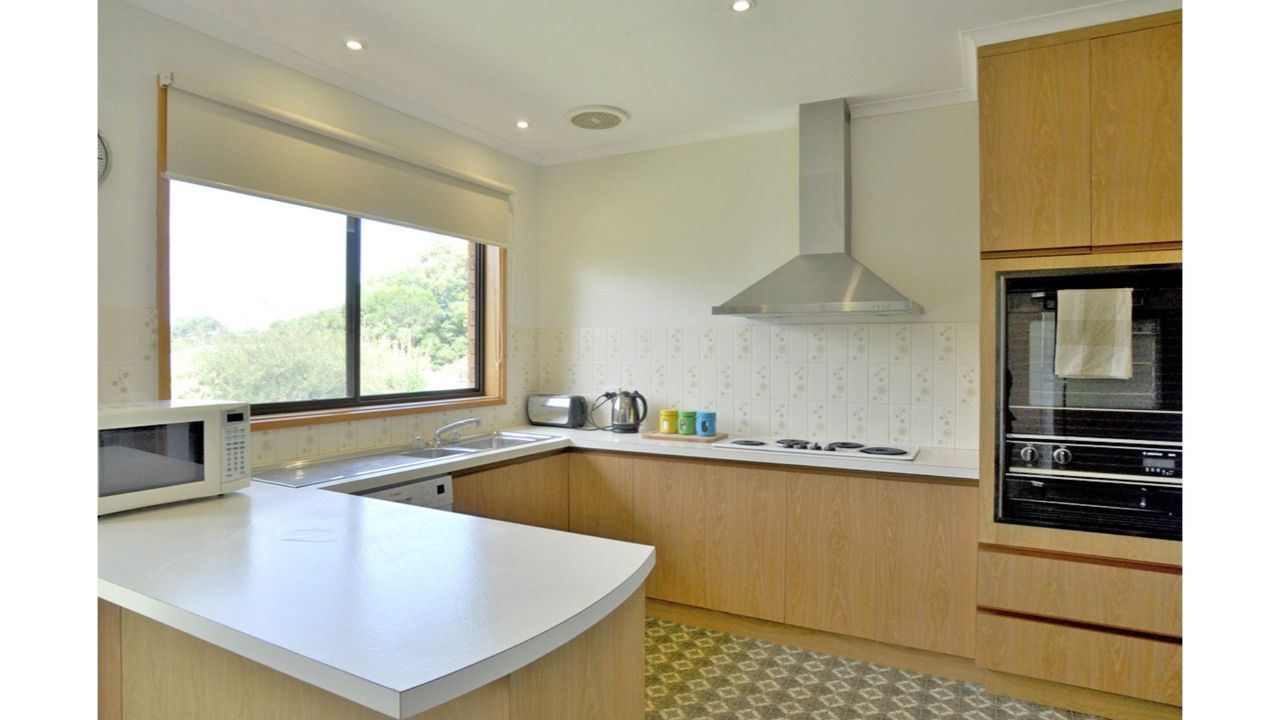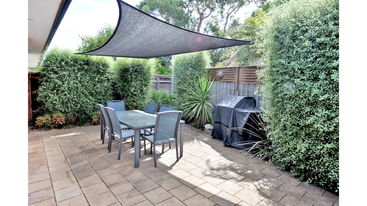 Through this room, you will also find the kitchen/dining room. The kitchen comes with an electric oven, separate electric stovetop and dishwasher, while the dining area has a lovely wooden dining set with room for eight. From the dining room, there is also access to the backyard with an entertaining area that has its own outdoor setting as well as a gas BBQ.