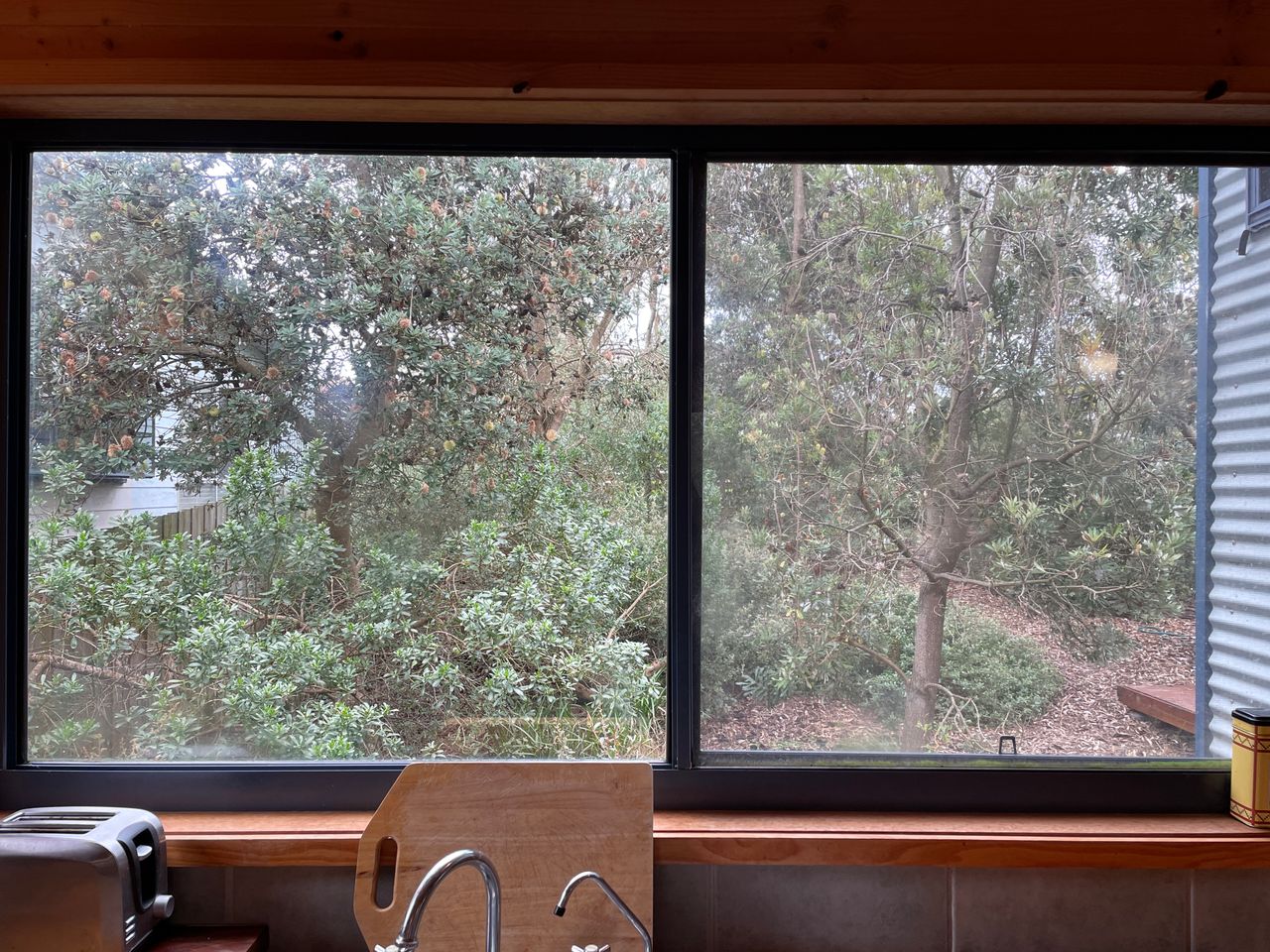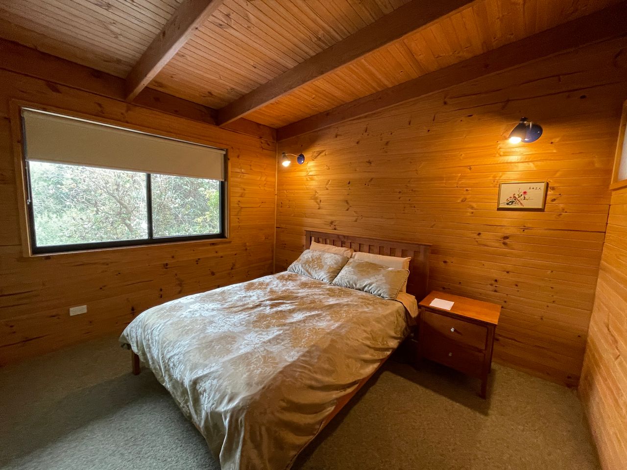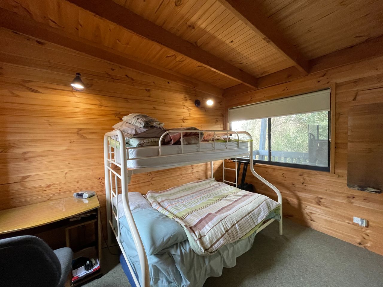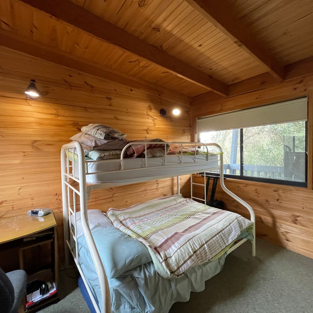 Upstairs you will enjoy cooking overlooking the native gardens in the large, modern open-plan kitchen and dining space. It really does feel like a treehouse as you will be sleeping amongst the treetops in the 2 bedrooms also located upstairs, the house can accommodate up to 5 people, the master bedroom sleeping up to 2 in a Queen bed, and the second bedroom accommodates up to 3 people in the tri-bunk.