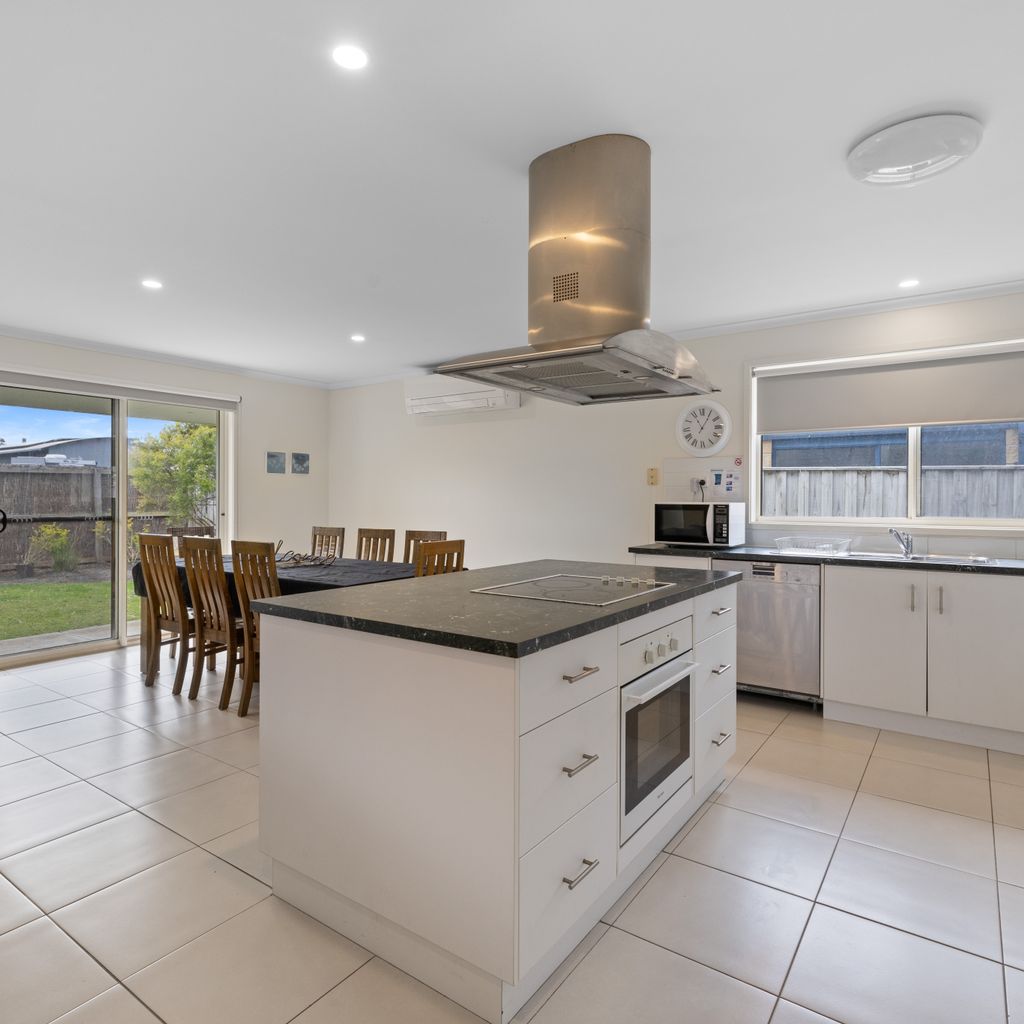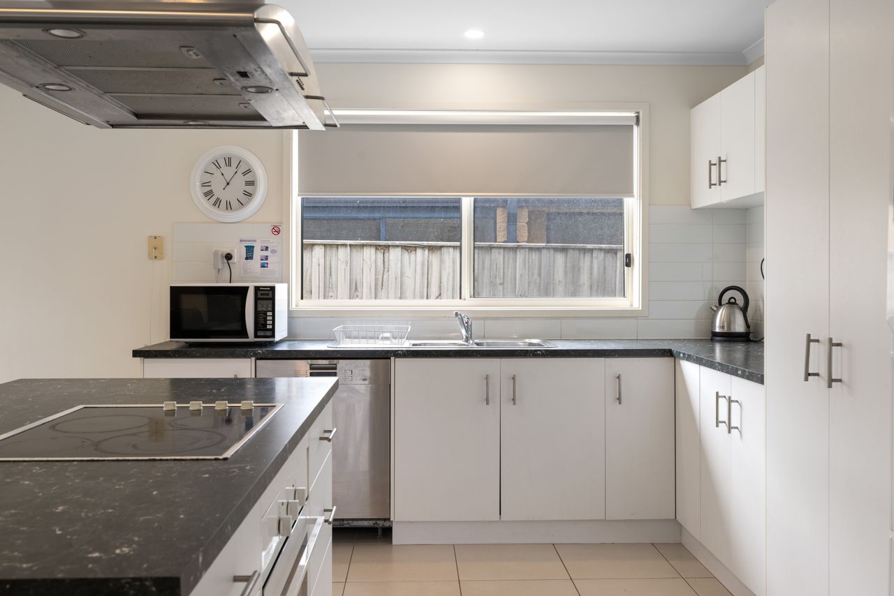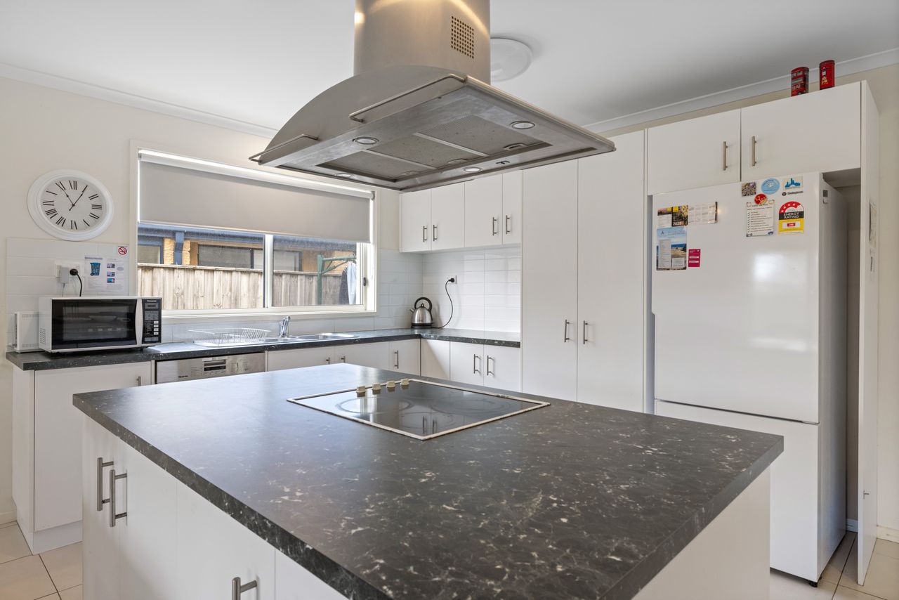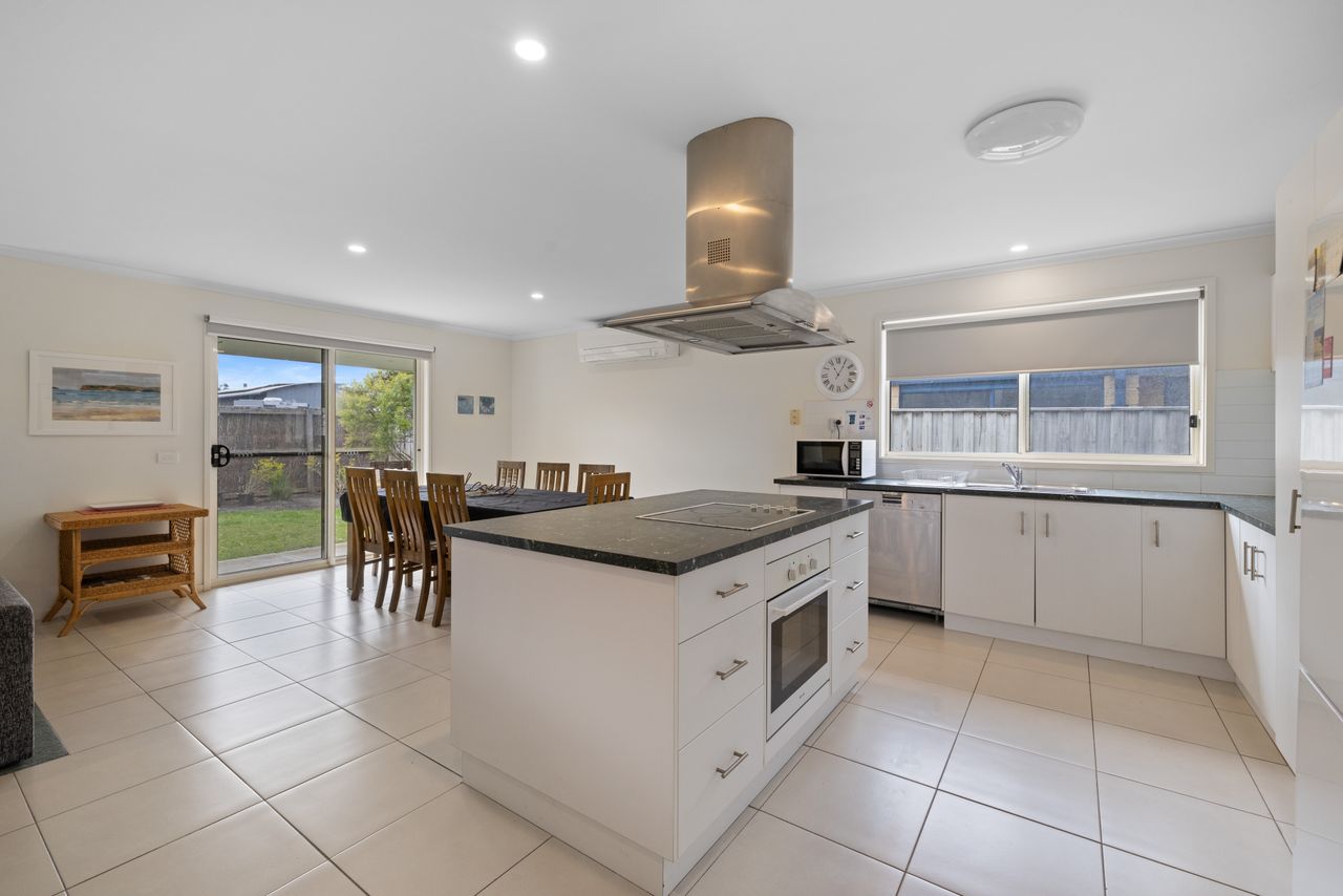 The kitchen is fully equipped with crockery and cutlery and features a spacious island bench with a built in stovetop, creating a central gathering spot where everyone can come together while meals are prepared. A modern laundry with direct backyard access, adds to your convenience. Your furry friends are welcome too! While pets are not permitted inside, the securely fenced property and covered deck (just off the kitchen and living area) mean they can stay close, sheltered and comfortable no matter the weather conditions. Whether you’re a large family, a couple of smaller families or a group of friends, Ohana Beach House offers the perfect combination of space, comfort and coastal charm, just minutes from the beach and Inverloch's main street.