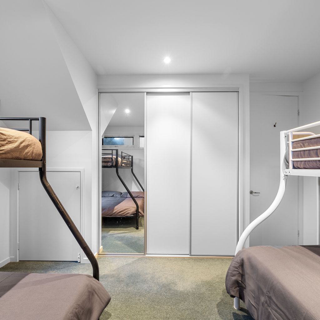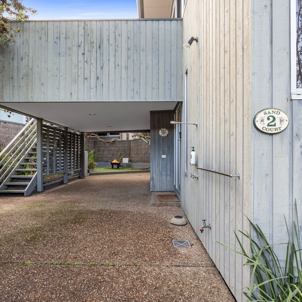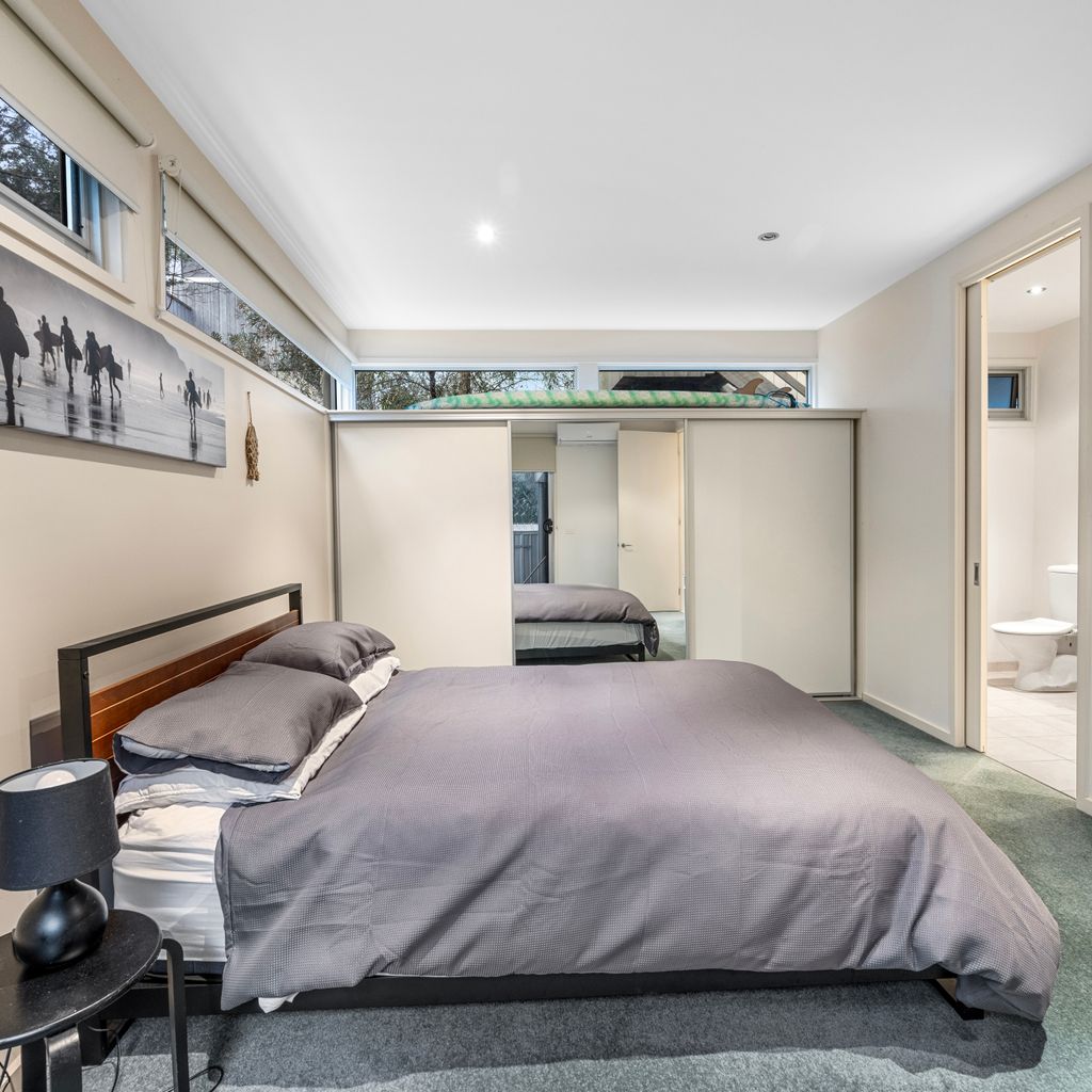 Discover Sandcastle Haven, your perfect coastal getaway just a 1 minute stroll from Inverloch’s stunning Surf Beach and surrounded by seaside charm. Accommodating up to eight guests, Sandcastle Haven is thoughtfully designed for a memorable getaway. Upstairs, you’ll find the bright open plan living and dining area, complete with a convenient powder room. Downstairs features two spacious bedrooms. The master bedroom includes a queen bed, ample storage, a TV, split system and a private ensuite. The second bedroom includes two tri bunk beds, split system, a TV and plenty of movies making it perfect for kids or groups to stay. A central bathroom with shower and toilet, plus a well equipped laundry space with a washer and dryer adds to the convenience.
