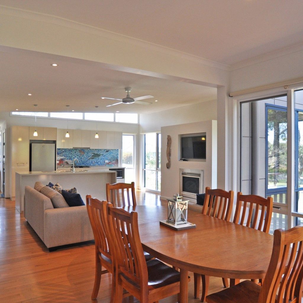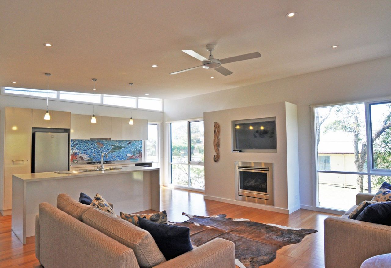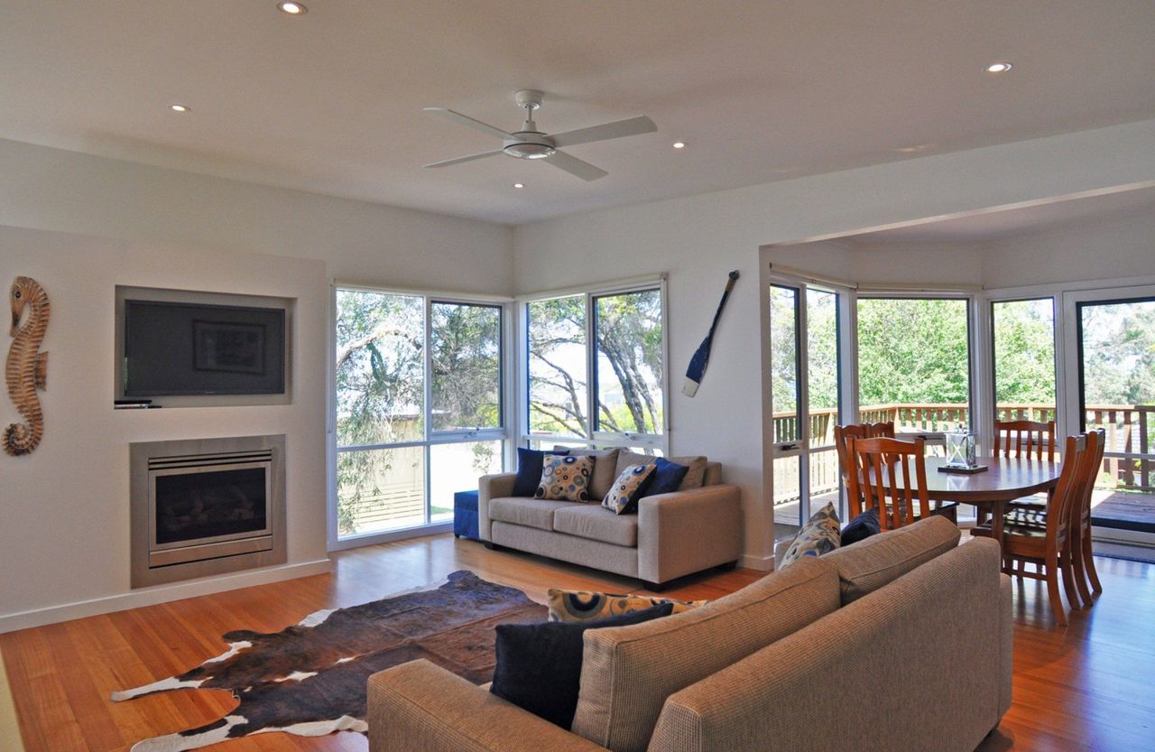 A gas log fireplace creates a cosy atmosphere in winter, ideal for curling up with a book or watching a movie on the flat-screen TV. In summer, the south-facing aspect and abundance of windows allow fresh sea breezes to naturally cool the home, supported by a split system air conditioner for year-round comfort.