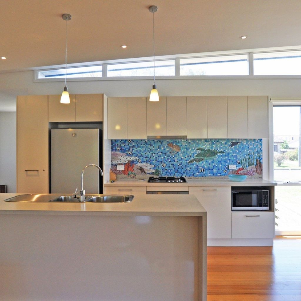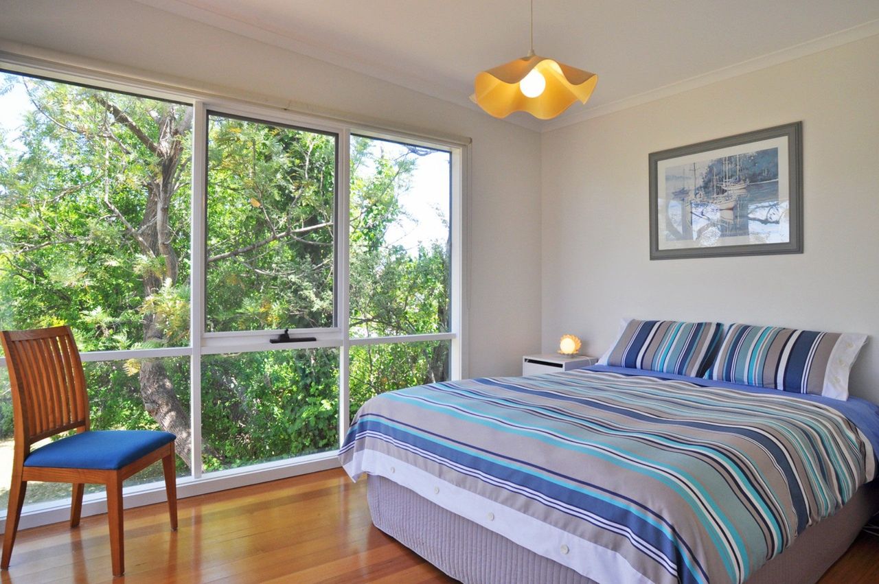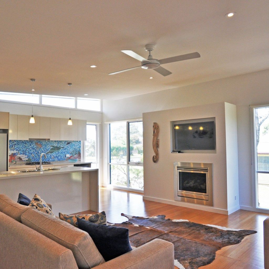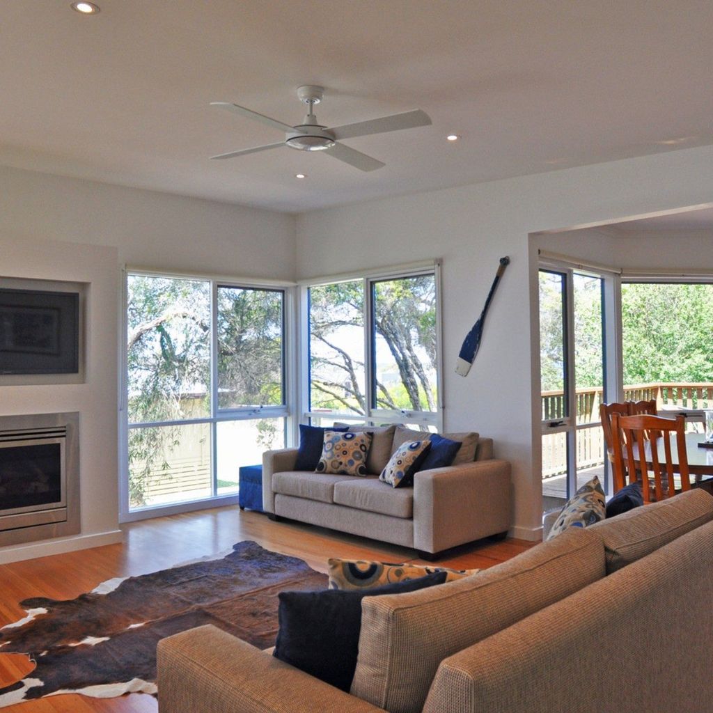 A gas log fireplace creates a cosy atmosphere in winter, ideal for curling up with a book or watching a movie on the flat-screen TV. In summer, the south-facing aspect and abundance of windows allow fresh sea breezes to naturally cool the home, supported by a split system air conditioner for year-round comfort.