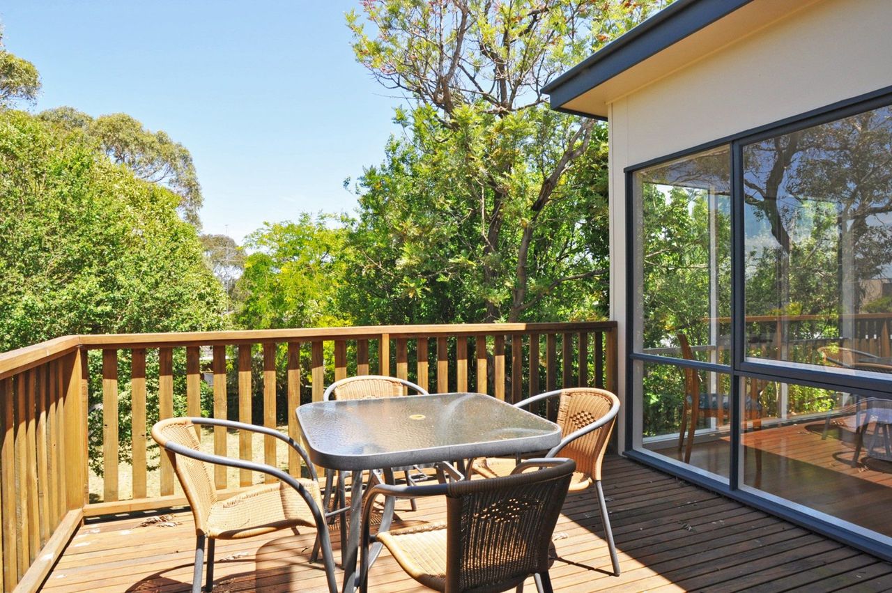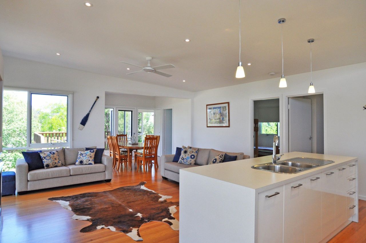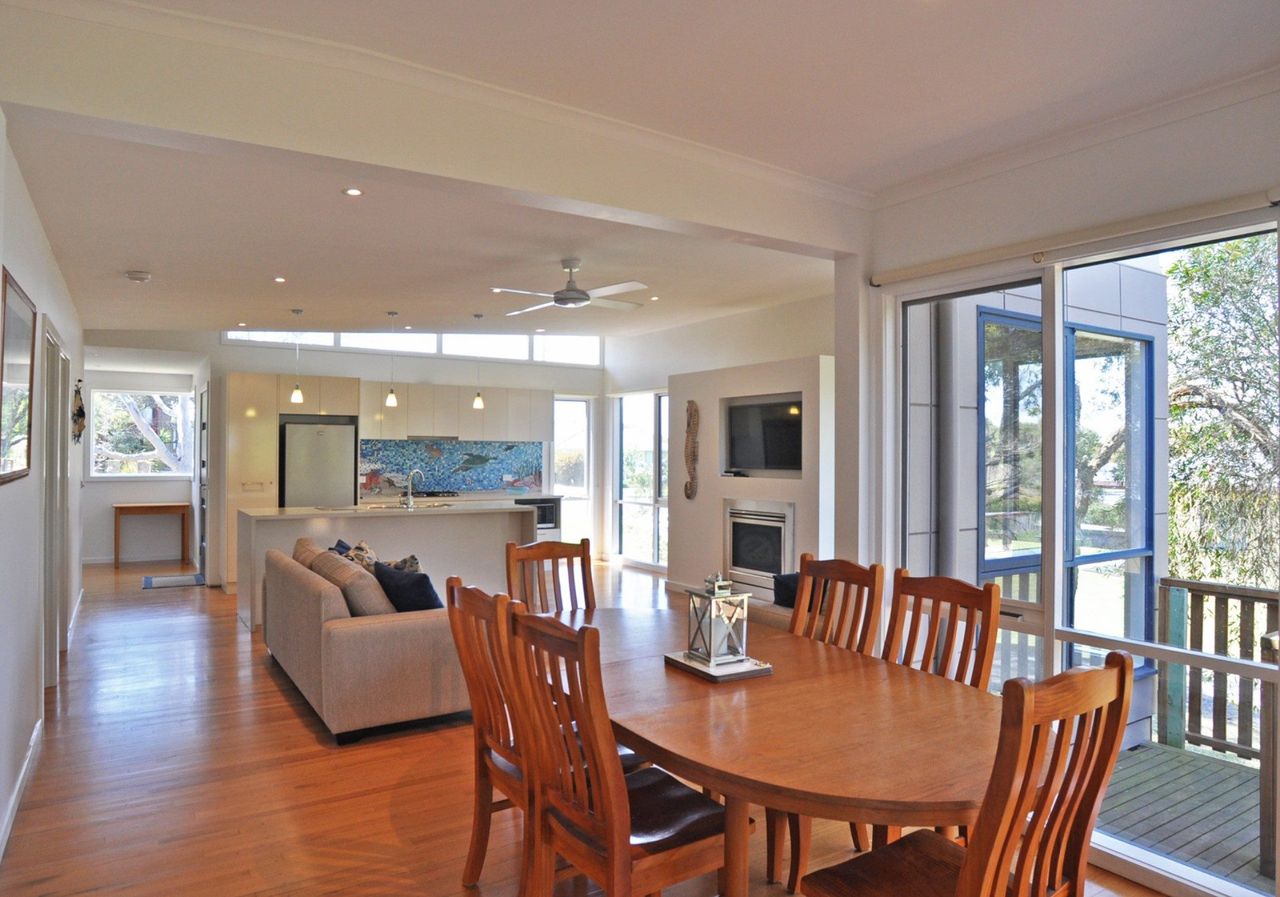 The large, fully equipped kitchen flows effortlessly into the dining and living area and out onto a private alfresco deck with ocean views, perfect for enjoying meals outdoors or unwinding with a drink.