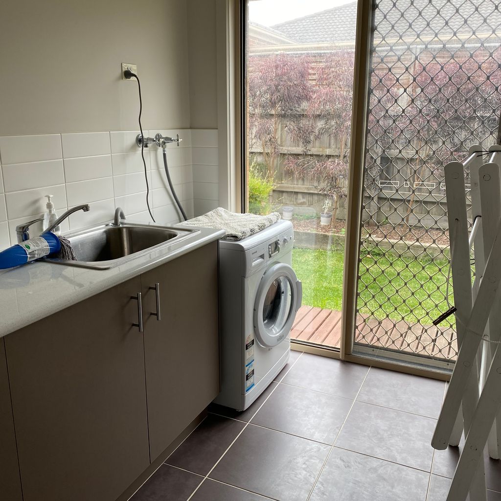 The main bathroom has a bathtub, shower and separate toilet. The laundry features a modern washing machine.