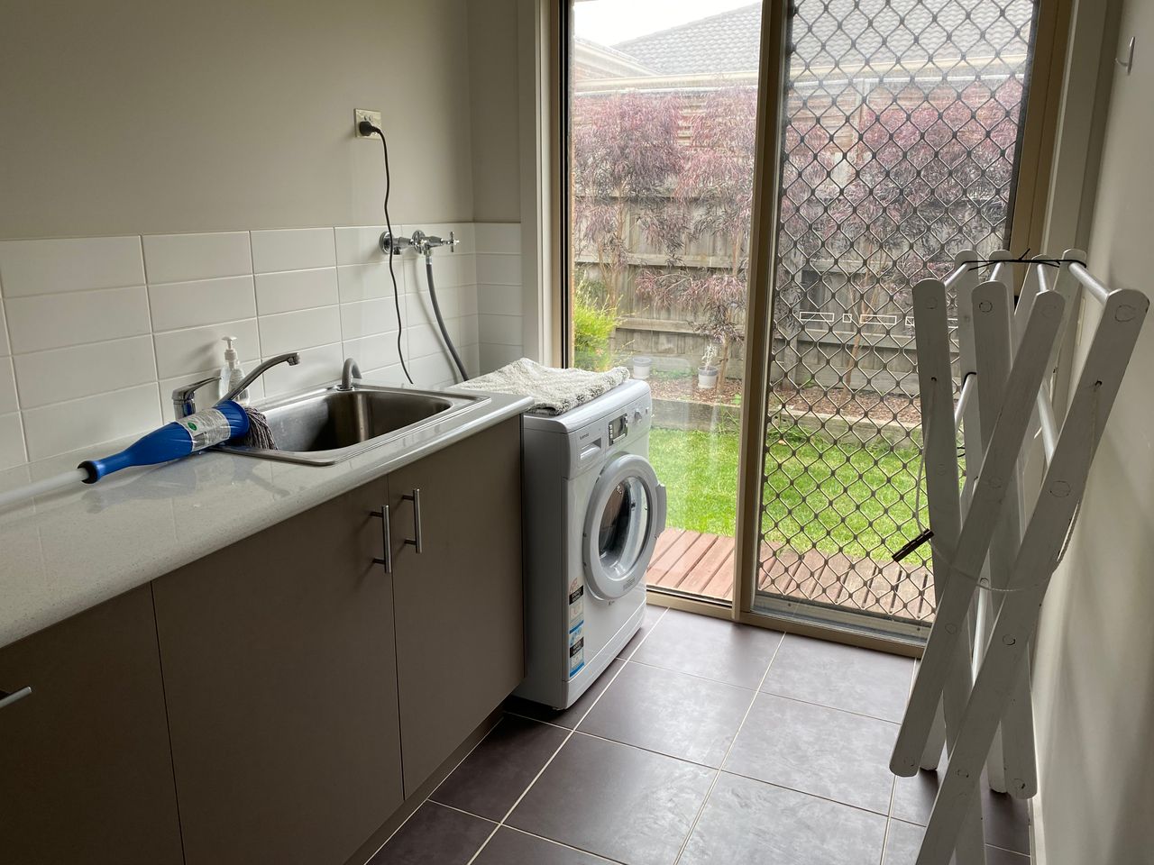 The main bathroom has a bathtub, shower and separate toilet. The laundry features a modern washing machine.
