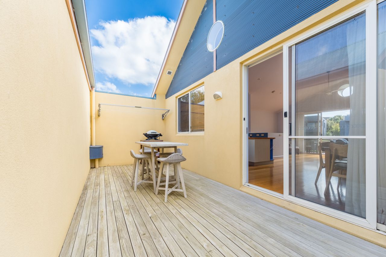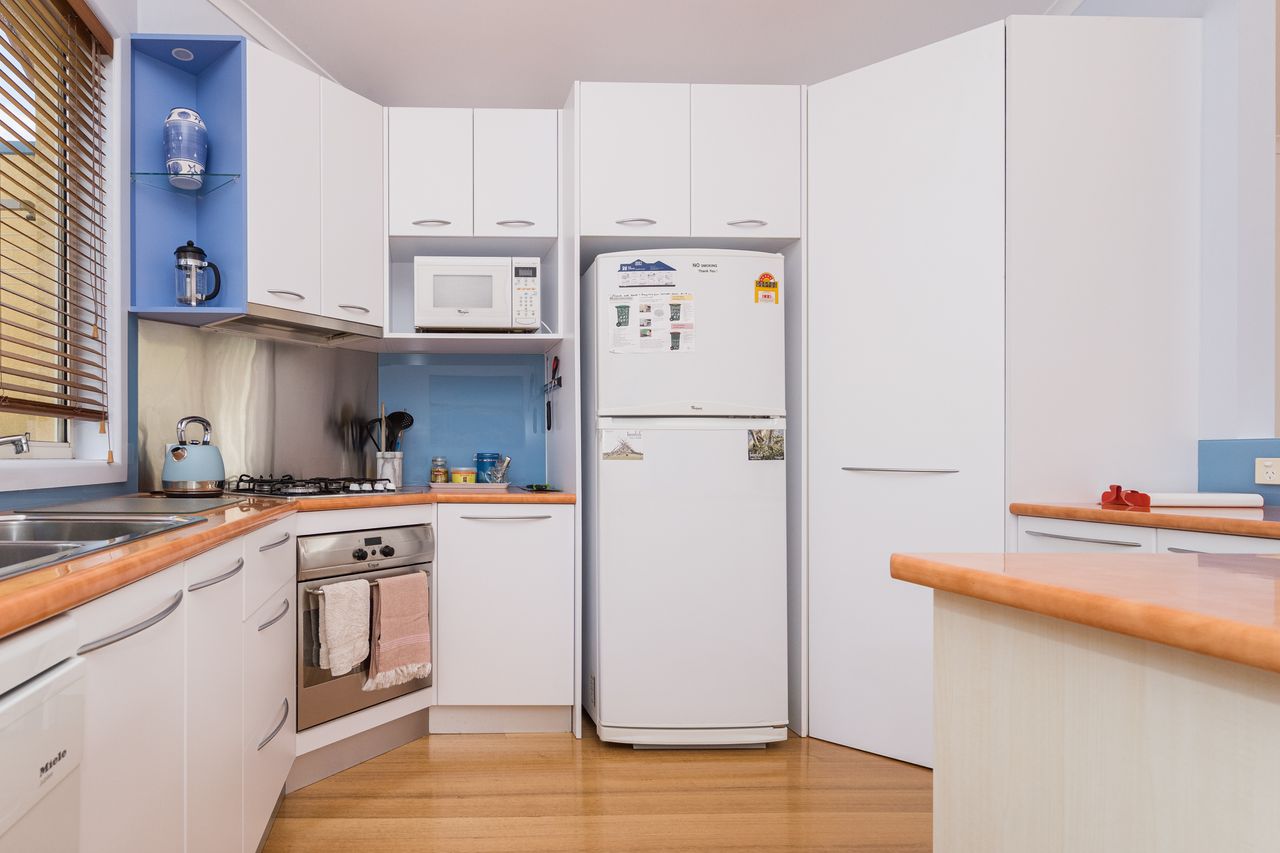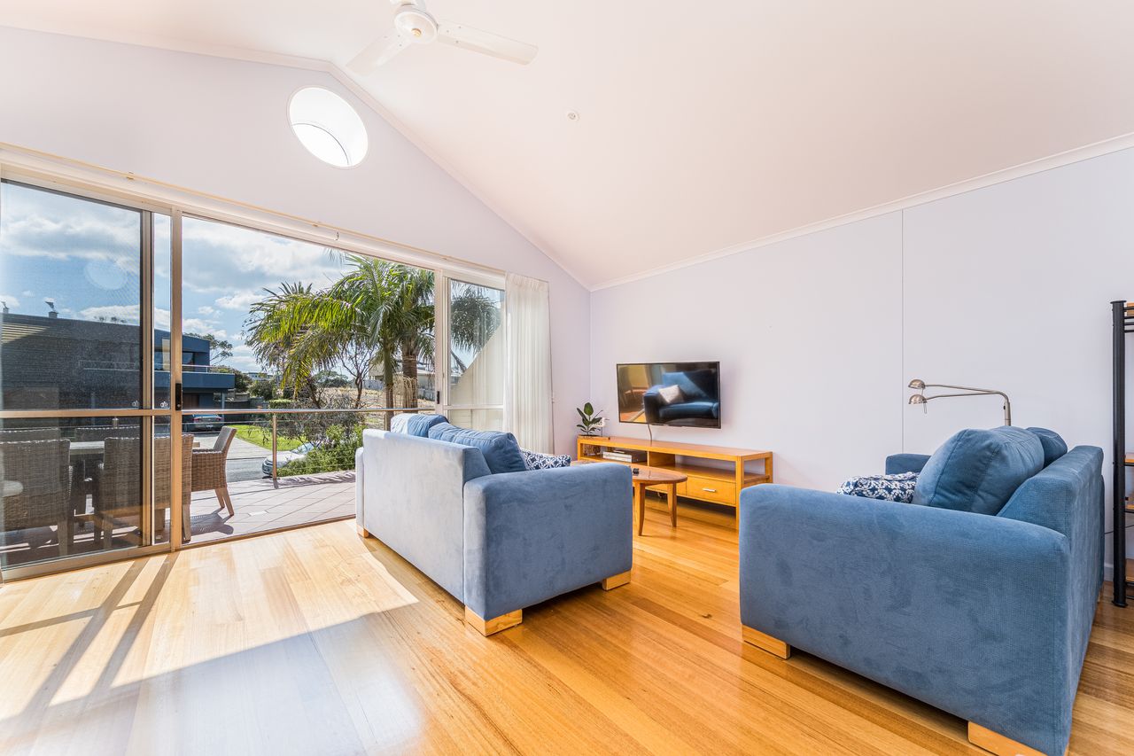Upstairs, the light filled open-plan kitchen, dining and lounge area creates a welcoming space for relaxation and entertaining. The kitchen has ample cupboard space, an electric oven, gas cooktop and microwave, while a six-seater dining table provides room for everyone to gather. The lounge area is complete with multiple couches, a flat-screen TV and a comfortable chair for unwinding after a day at the beach. The north-facing decks allow for sunny winter mornings, while the property’s proximity to the beach brings refreshing sea breezes in summer. Both front and rear balconies feature outdoor seating, with the rear deck also equipped with a Weber BBQ. Guests can also enjoy a second communal BBQ within The Sails complex. With its blend of comfort, style and a central location, The Sails 8 offers a memorable coastal retreat in the heart of Inverloch.
